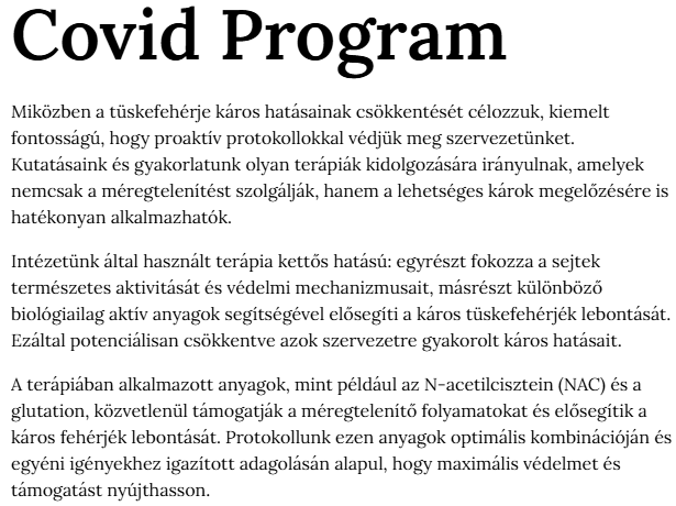 A terápiában alkalmazott anyagok, mint például az N-acetilcisztein (NAC) és a glutation, támogatják a méregtelenítő folyamatokat. Protokollunk ezen anyagok egyéni igényekhez igazított kombinációján alapul, hogy optimális támogatást nyújthasson. A terápia főbb elemei és lehetséges előnyei: